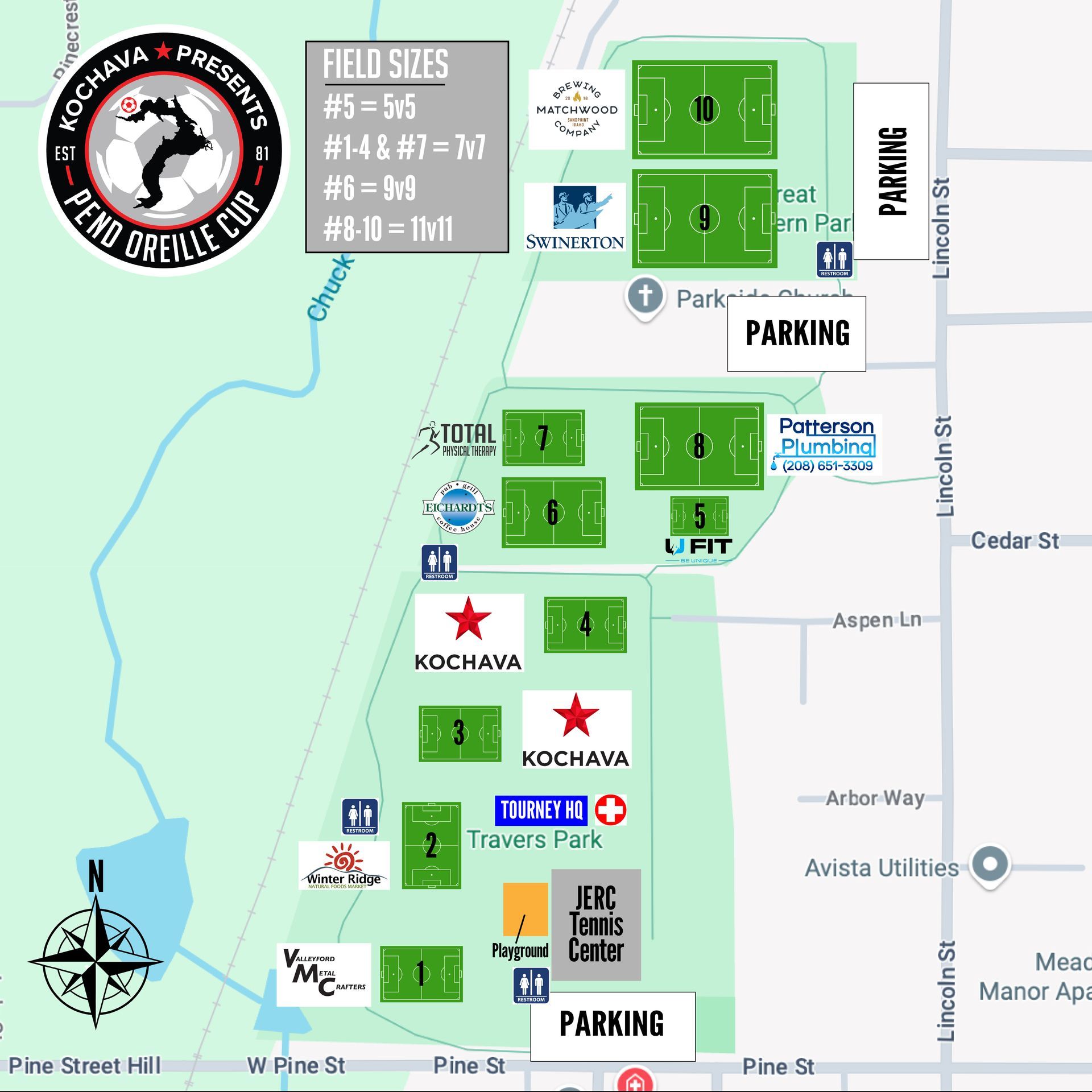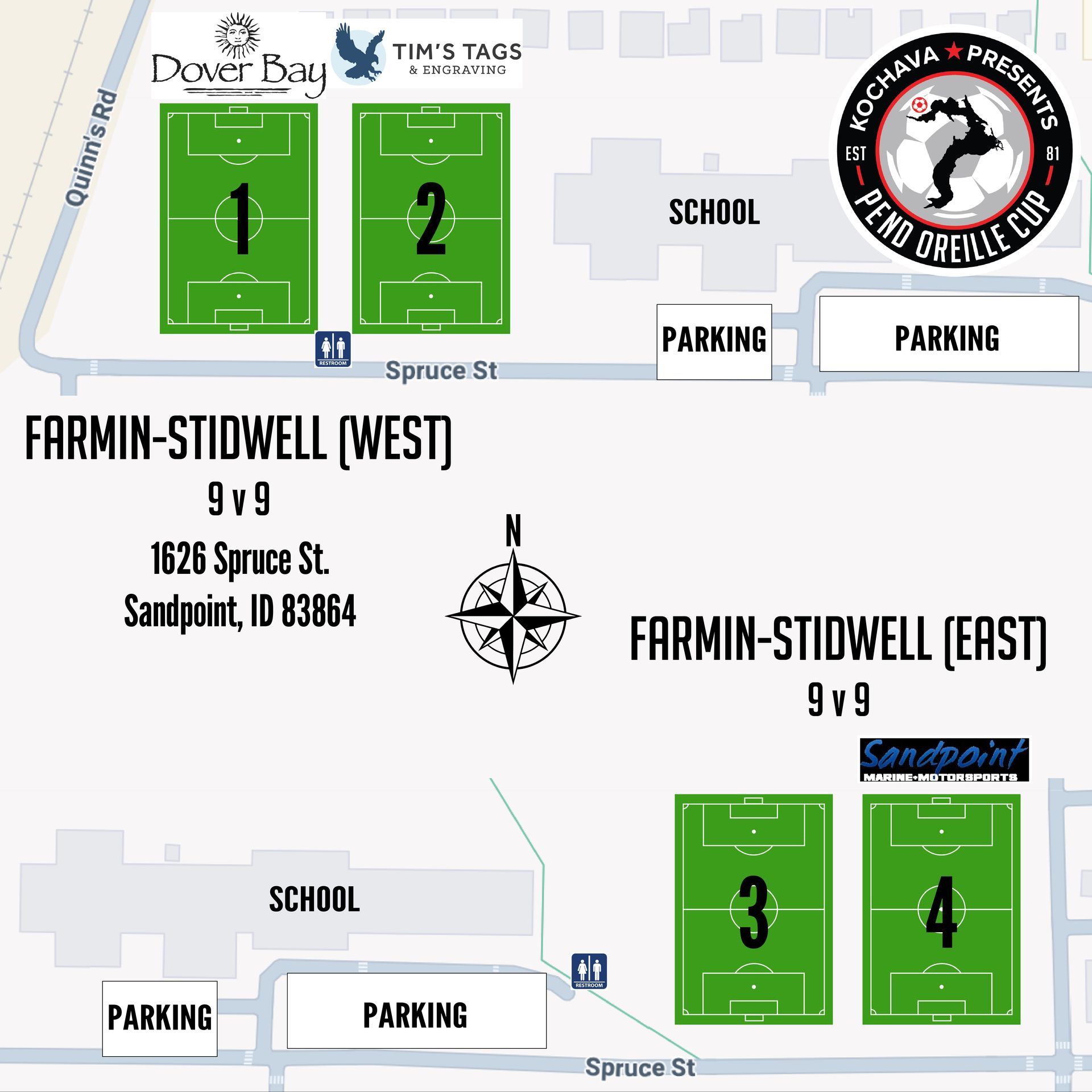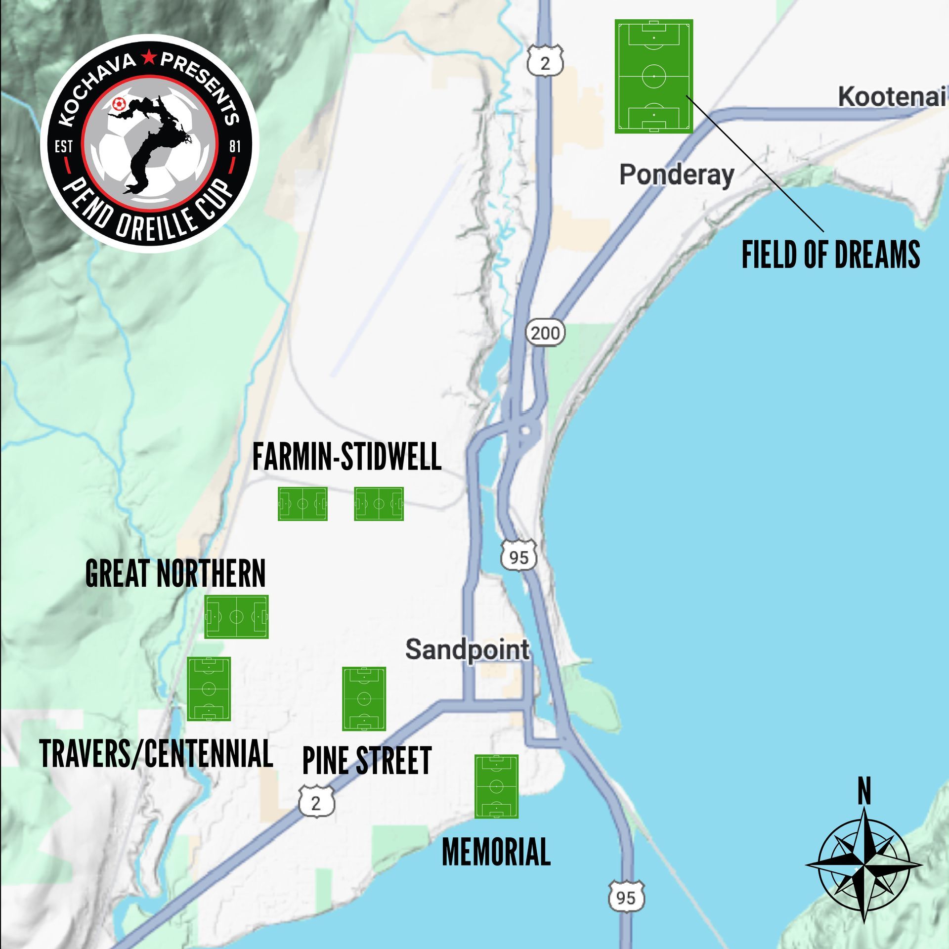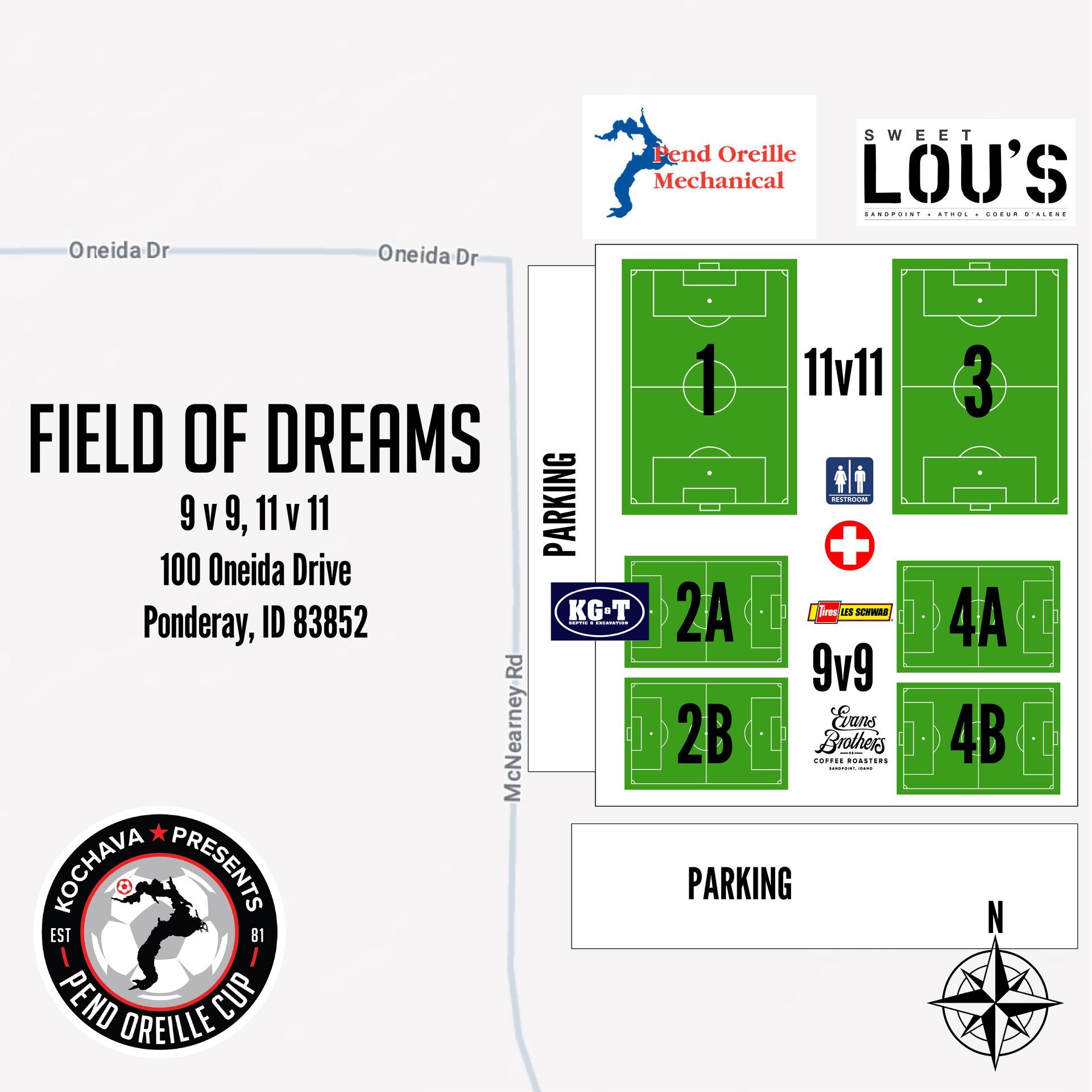 The majority of fields are located within Sandpoint, Idaho city limits, with the Field of Dreams venue residing 10 minutes away to the NE in Ponderay, Idaho.